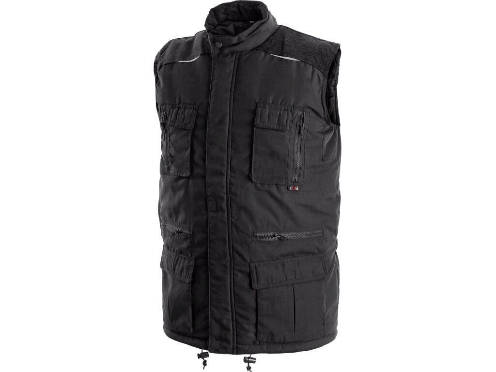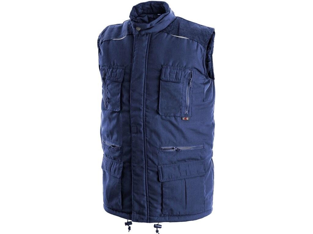 Zateplená vesta, ramena a límec pošitý manšestrem, pružné stažení průramku, možnost stažení vesty v pase, 14 kapes - z toho 3 kapsy uvnitř vesty.Doplňkové parametry