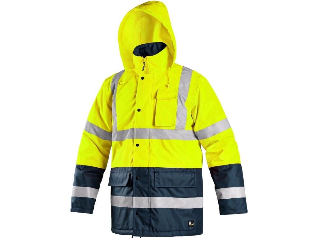 Pánská výstražná bunda s reflexními pruhy a kapucí v límci, zateplená, odolná proti vodě a větru, kryté zapínání na zip a druky, 3 vnější kapsy + skrytá kapsa u hlavního zipu, vnitřní náprsní kapsa, vnitřní manžety v rukávech, stahování v dolním okraDoplňkové parametry